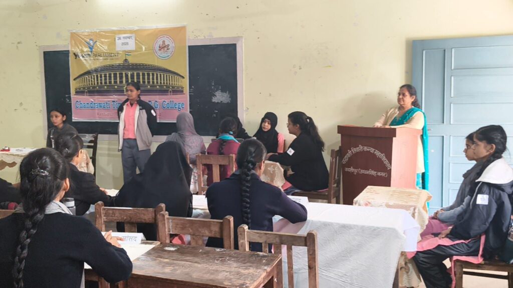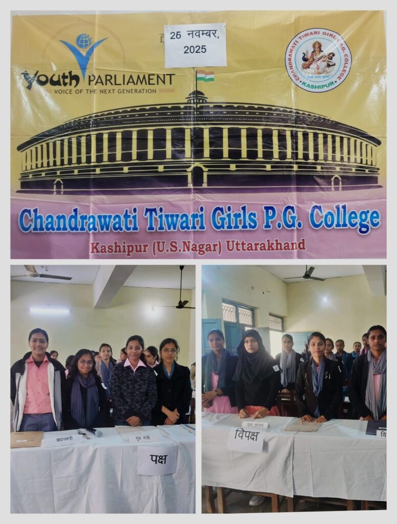 महाविद्यालय की प्राचार्या डाॅ0 कीर्ति पन्त के निर्देशन एवं नोडल अधिकारी डाॅ0 रंजना के संयोजन में राष्ट्रीय युवा संसद महोत्सव का आयोजन किया गया। जिसमें छात्राओं को संसदीय प्रक्रिया संचालन की जानकारी दी गई।