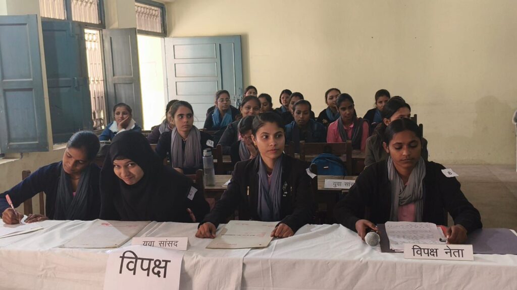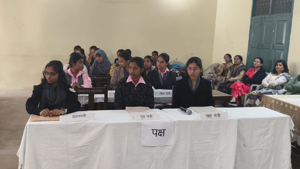 सदन में अध्यक्ष की भूमिका में वेदिका, प्रधानमन्त्री की भूमिका में काजल कश्यप एवं विपक्ष के नेता की भूमिका में रीना कौर रहीं। कार्यक्रम का संचालन नोडल अधिकारी डाॅ0 रंजना ने किया। संसदीय कार्यवाही पूर्ण होने के बाद प्राचार्या द्वारा छात्राओं को सम्बोधित करते हुए उनके प्रदर्शन की प्रशंसा की एवं उन्हें संसदीय परम्पराओं से अवगत कराया।