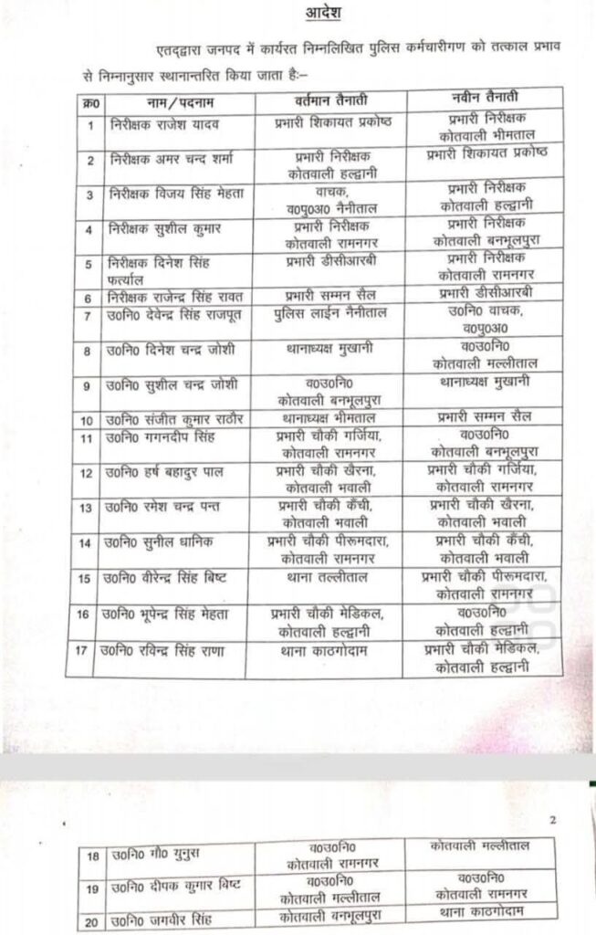 जिले में कानून व्यवस्था को और अधिक मजबूत और सुदृढ़ करने के उद्देश्य से एसएसपी मंजूनाथ टी.सी. ने देर रात पुलिस विभाग में बड़े पैमाने पर तबादलों के आदेश जारी किए। इस आदेश के बाद जिले में कई इंस्पेक्टर एवं सब-इंस्पेक्टर को थाना और चौकियों की नई कमान सौंपी गई है।