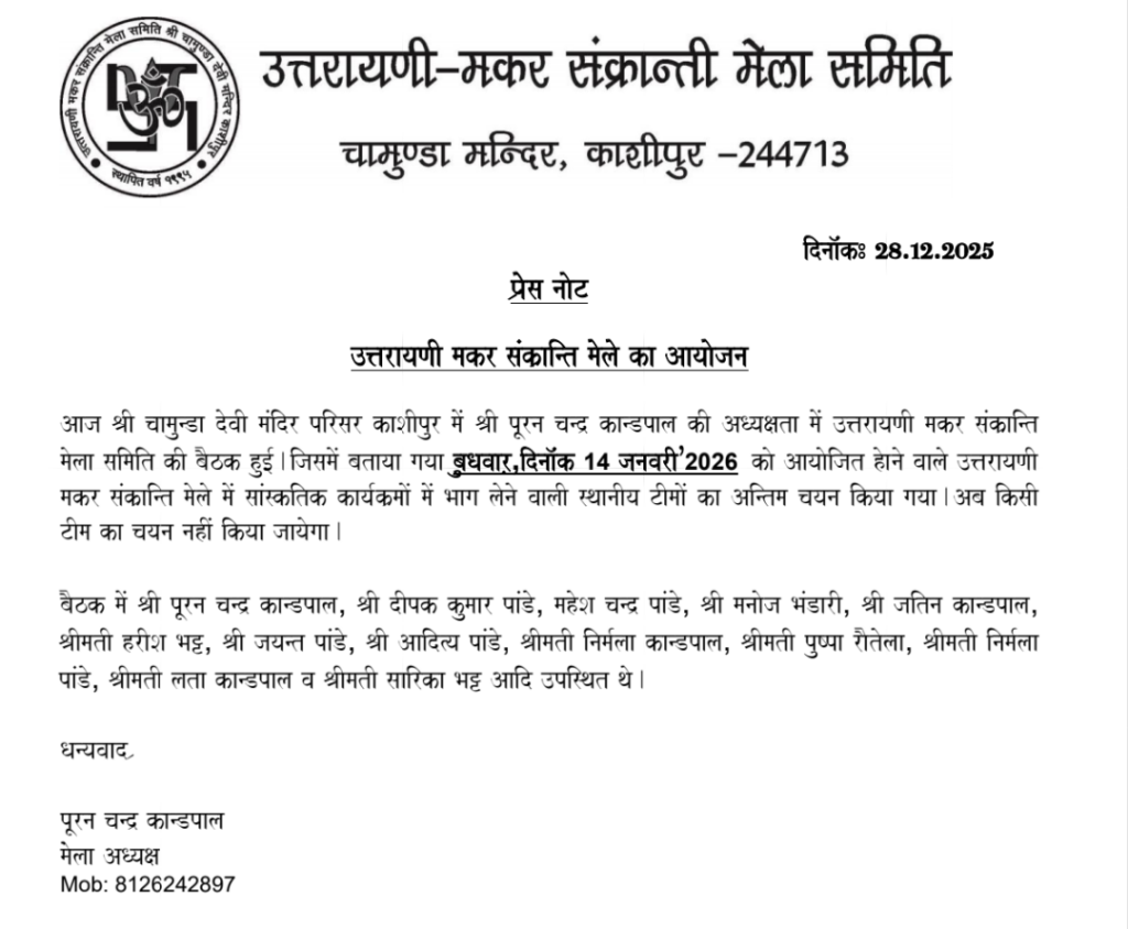 मेला समिति ने बताया कि उत्तरायणी मकर संक्रांति मेला क्षेत्र की लोक संस्कृति, परंपरा और सामाजिक एकता का प्रतीक है, जिसे भव्य और सुव्यवस्थित रूप से आयोजित किया जाएगा।