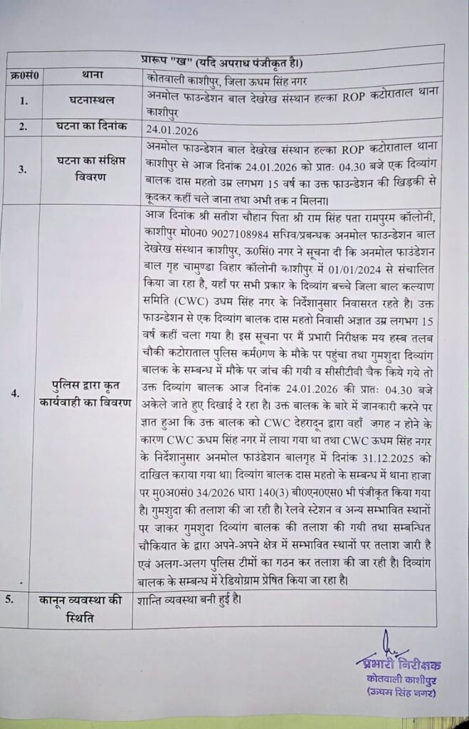 काशीपुर|- अनमोल फाउंडेशन से 15 वर्षीय दिव्यांग बालक लापता, पुलिस ने दर्ज किया मुकदमा