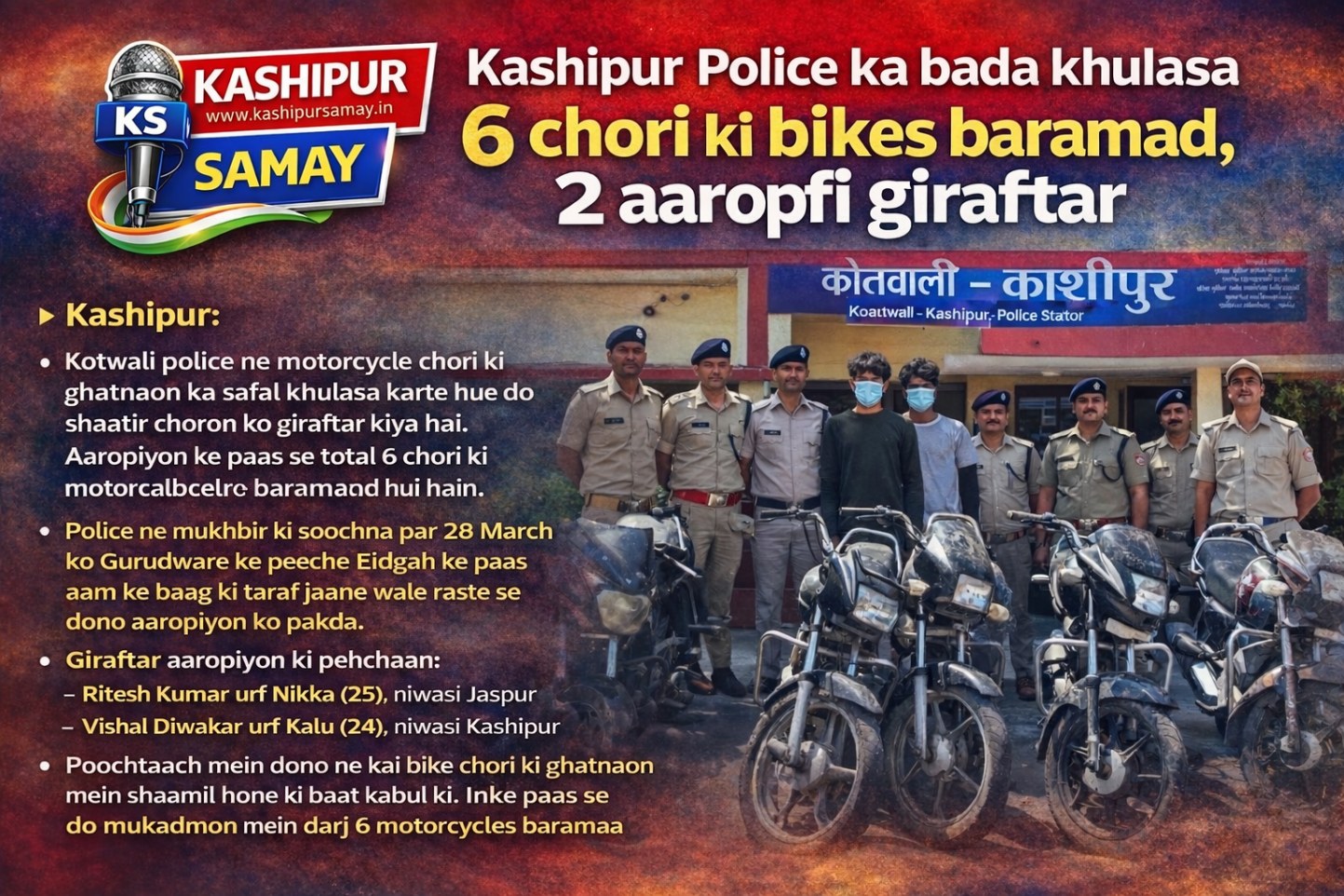 काशीपुर – आईटीआई कोतवाली पुलिस ने चैती मेले में पकोड़ी की ठेली लगाने वाली महिला की पिटाई करने वाली 7 महिला बाउंसर को गिरफ्तार कर कोर्ट में पेश कर दिया। आपको बता दें कि दिनांक 2 अप्रैल 2026 को ग्राम धरमपुरा, टांडा, जिला रामपुर (उत्तर प्रदेश) निवासी सुषमा ने पुलिस को तहरीर देकर बताया कि उसकी चैती मेले में पकोड़ी की अस्थाई ठेली है,